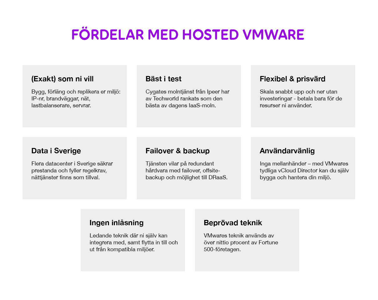 Hosted VMware bygger på VMware vCloud och är en flexibel molnbaserad plattform. Cygate erbjuder en modern och redundant vCloudlösning baserad i Sverige (dina viktiga data hamnar inte i utlandet) som är utformad enligt ”On Demand”-principen. Varje kund kan själv fritt och omedelbart hantera sin del av molnet. Kunden har full kontroll på nätverksinställningar, brandväggsregler, operativsystem, applikationer, lagringsytan, processorer, minneskapaciteten, nätverkskort etc.